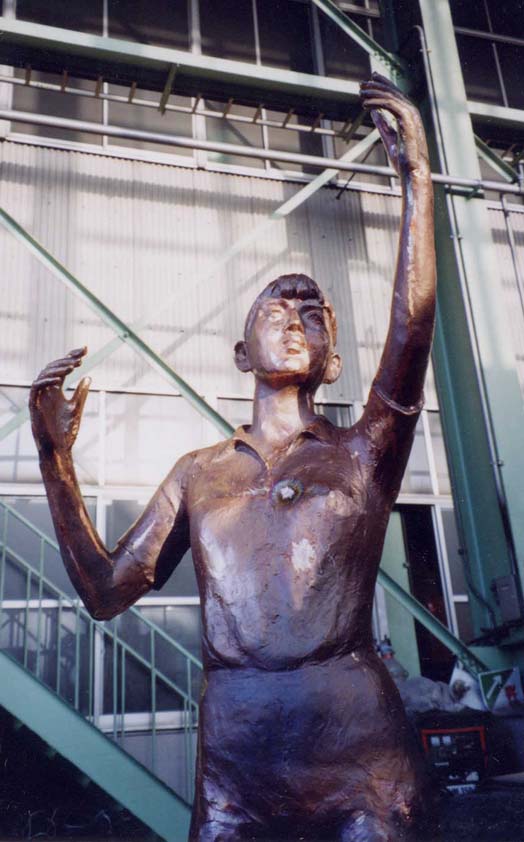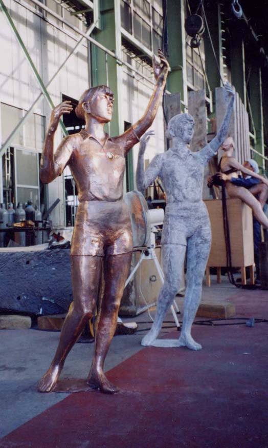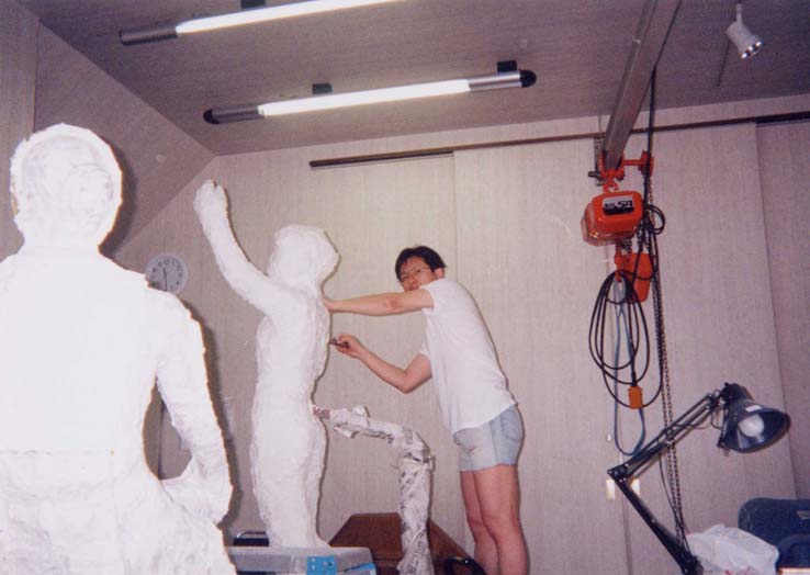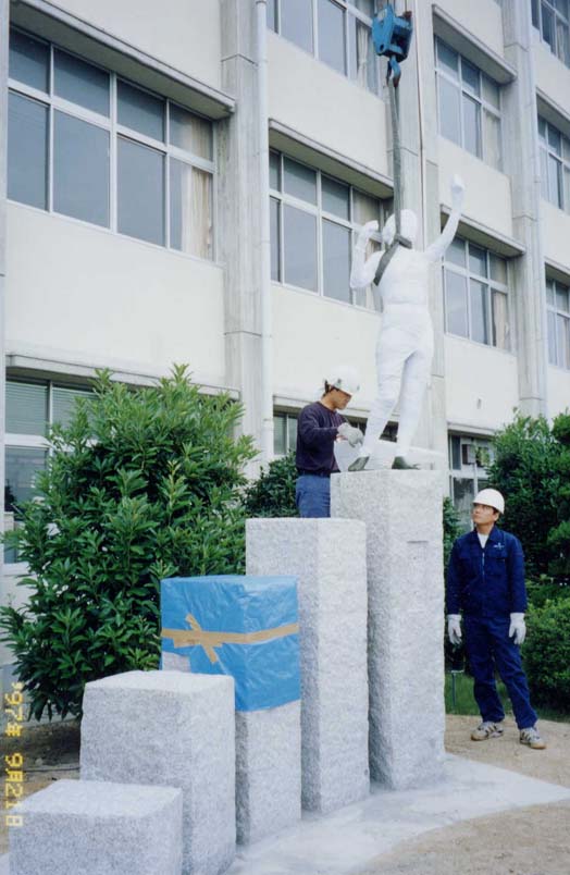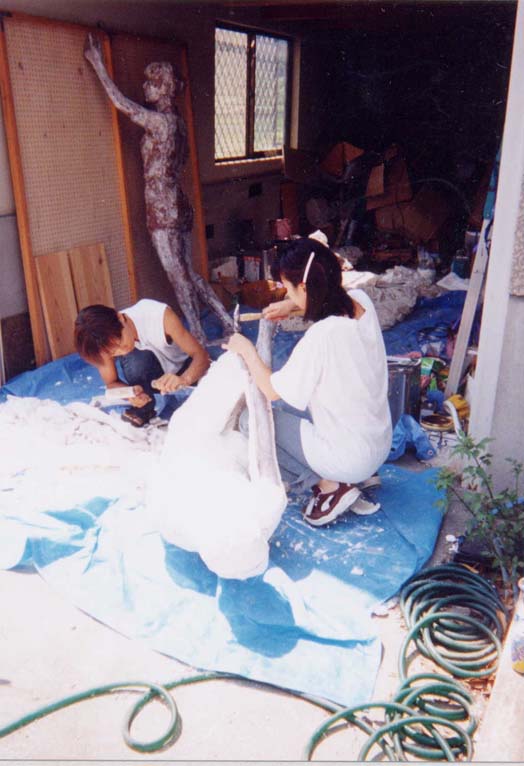 今回の制作は、構想に2年ほど費やし、アイデアを練りました。実際の制作は1996年12月から1997年9月まで10ヶ月かかりました。エスキース(習作)を作りいろいろな角度から検討。最初男女の組み合わせで考えていたのですが、構成を階段状にすることにしてから女生徒2人にしました。男女にすると上下を作ってしまうので性差別が問題になります。また、制服姿にするつもりだったのですが、そのうち制服が変わったり廃止されるかも分かりません。裸婦は学校には合わず、かといって夏服か冬服か、など考え出すと限がありません。このようにモニュメントを制作する時さまざまな条件をクリアしていかなくてはならないのです。構想から完成まで実に3年。私自身教員の仕事をしながらの制作は、時に睡眠3,4時間の生活になり、時には授業が終わってから富山県や岡山県を往復したこともあります。しかし、完成後、学校の風景に溶け込み、卒業式の日この像の前に立って記念撮影する生徒たちを見ていると、彫刻家として創り続ける幸福を感じます。
