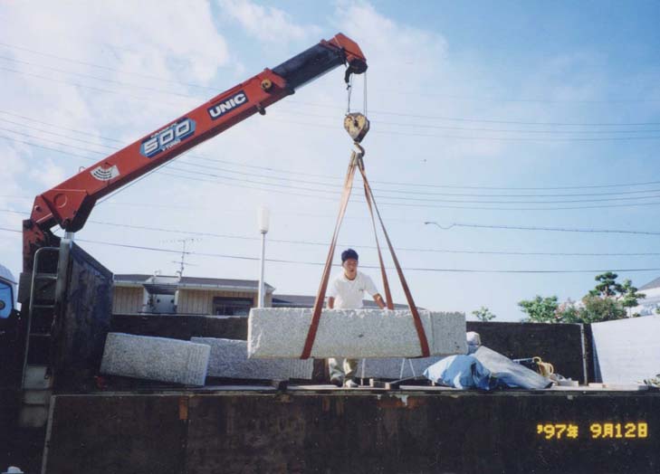 I岡山県から出来上がった台石を運びいよいよ設置です。設計図通り合うか緊張の時です